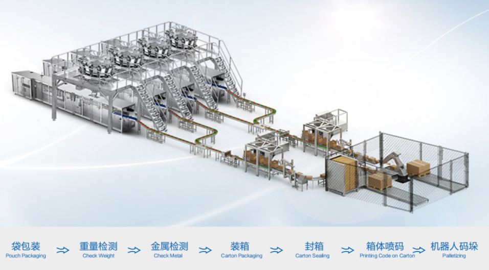 该项目为全自动自立袋包装整线解决方案,物料经4台全自动水平式自立袋包装机进行包装,并完成包装袋的日期打码;自立袋成品经输送带由称重系统对单袋进行检重,剔除重量不合格产品,对合格产品进行在线金属检测;成品输送到装箱机整列输送线上,装箱机自动整列装箱;开箱机自动开箱,输送给装箱机;装箱成品经输送带送入自动封箱机封箱,大字箱体喷码;合格的成品箱经由码垛机器人进行全自动码垛。整线为全自动化,由整线连线总控制系统控制。